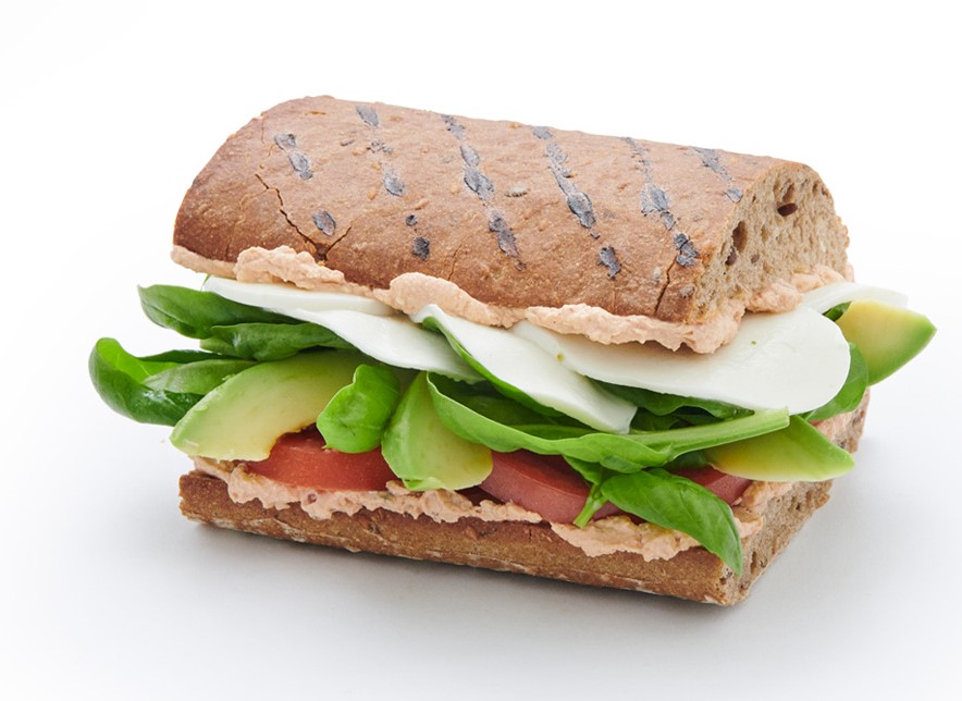 Avocado Mozzarella Sandwich frisch grilliertes Sandwich mit Avocado, Mozzarella, sonnengereiften Rispentomaten, Babyspinat, frischem Basilikum und Sundried Tomato Aufstrich