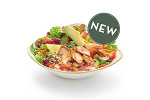 056 Avocaodo Chicken Bowl mit grillierten Schweizer Pouletbruststreifen, Avocado, sonnengereiften Cherrytomaten, knackigen Peperoni, frischem Koriander, Frühlingszwiebeln, Limette warmen Quinoa & Vollkornreis und frischem Salat. Dazu unsere Mexican Salsa.