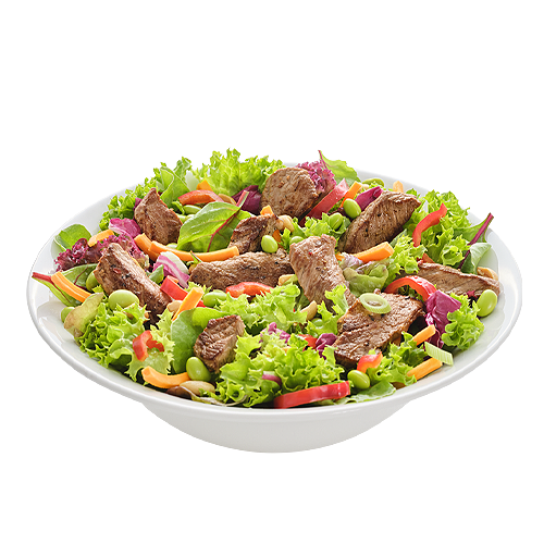 012 Big Easy Beef Salad mit frisch gegrilltem Schweizer Rindfleisch, Edamame, knackiger Karotte, Paprika, Erdnüsse und Frühlingszwiebel. Dazu empfehlen wir unser Balsamico Ahornsirup Dressing.