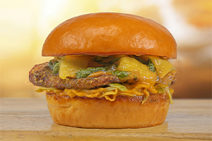 040 Delhi Green Vegan Veganes Plätzli aus Kartoffeln und Erbsen, Green Masala, Eisbergsalat, hausgemachtes Mangochutney und hausgemachte Masala-Sauce