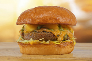 035 Hot Fury Rindfleischburger, knuspriger Bacon, eingemachte Chilies, frittierte Zwiebeln, Cheddar, scharfe Chipotle Sauce