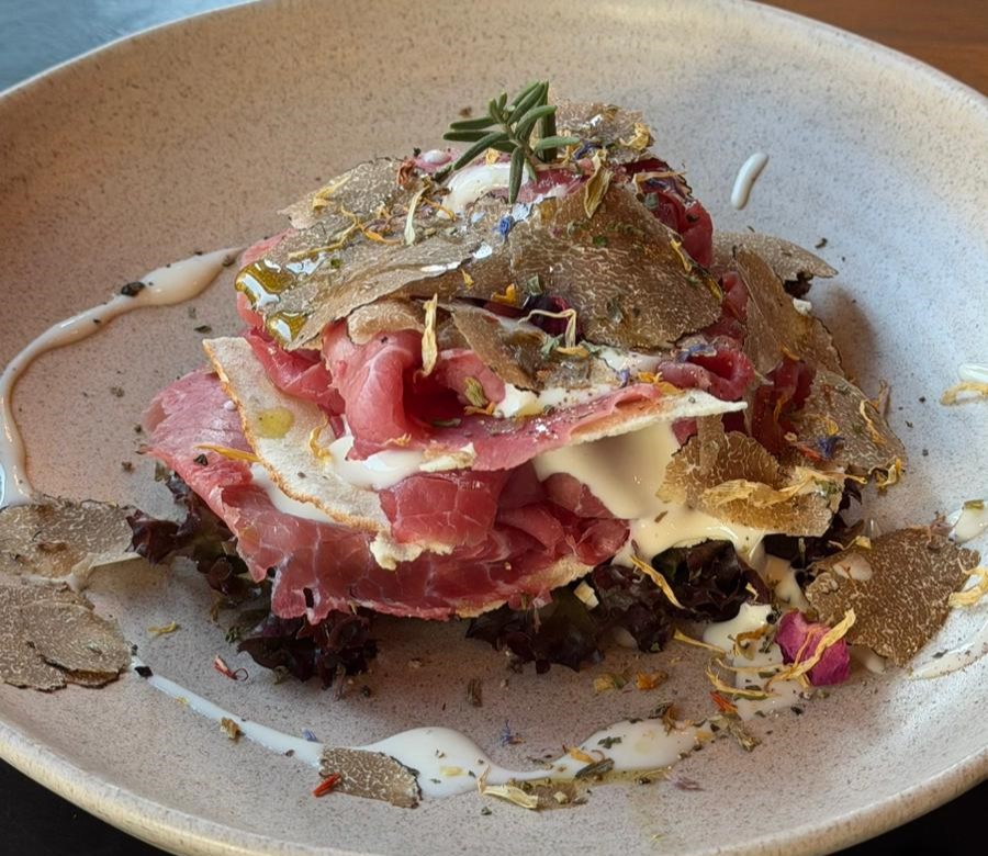 CARPACCION DI CARNE SALARA CON TARTUFO Rohe, leicht gesalzene zarte Rindfleischtranchen aus dem Trentino mit schwarzem Trüffel und Taleggio