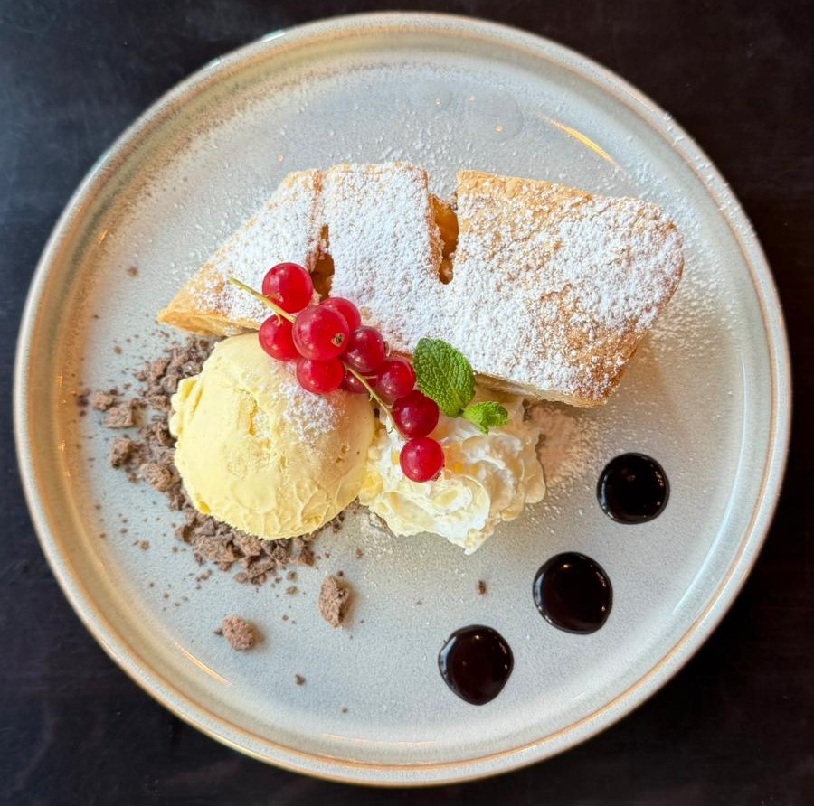 MILLEFOGLIE AI FRUTTI DI BOSCO Hausgemachtes Blätterteiggebäck mit Waldfrüchten, Vanillecrème und Schlagrahm