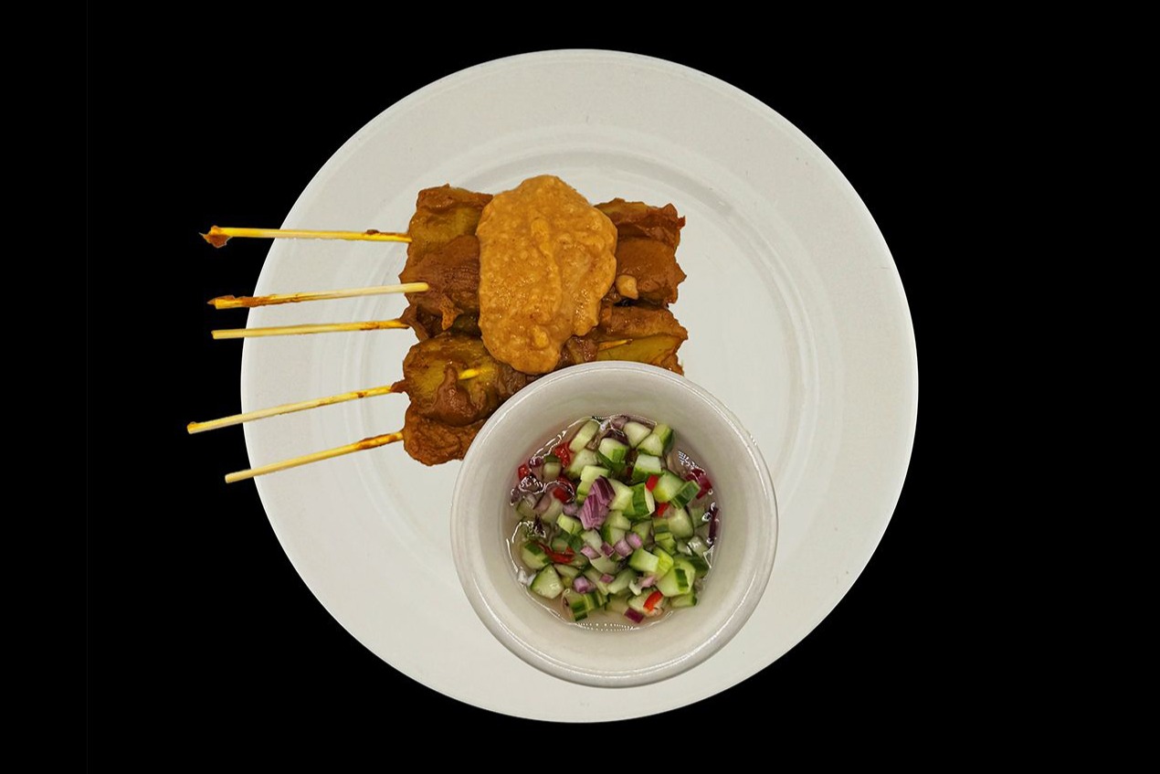A4 SATAY 2.0 Spiesse mit cryofermentierten Bio-Kräuterseitlingen aus Kerns, 5 Stück, hauseigene Sataymarinade, vegane Erdnusssauce und Ajad-Gurken