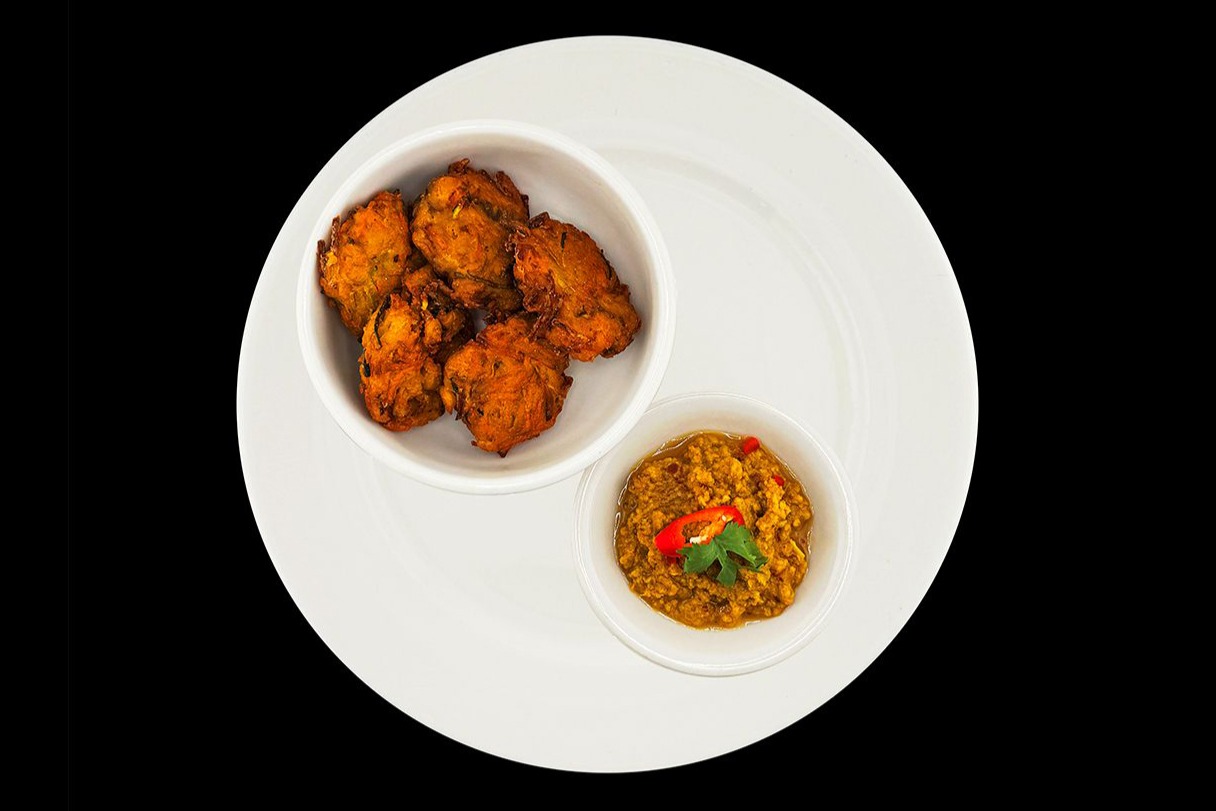 A5 CHICKPEA PAKORA Frittierte Leimenhofer Kichererbsen Crunchies mit Frühgemüse, Shiitake, 5 Stück, dazu Chutney aus grünen Kornellkirschen von Eva Kollmann vom Landgut Weitsicht, Chili, Senfsaat