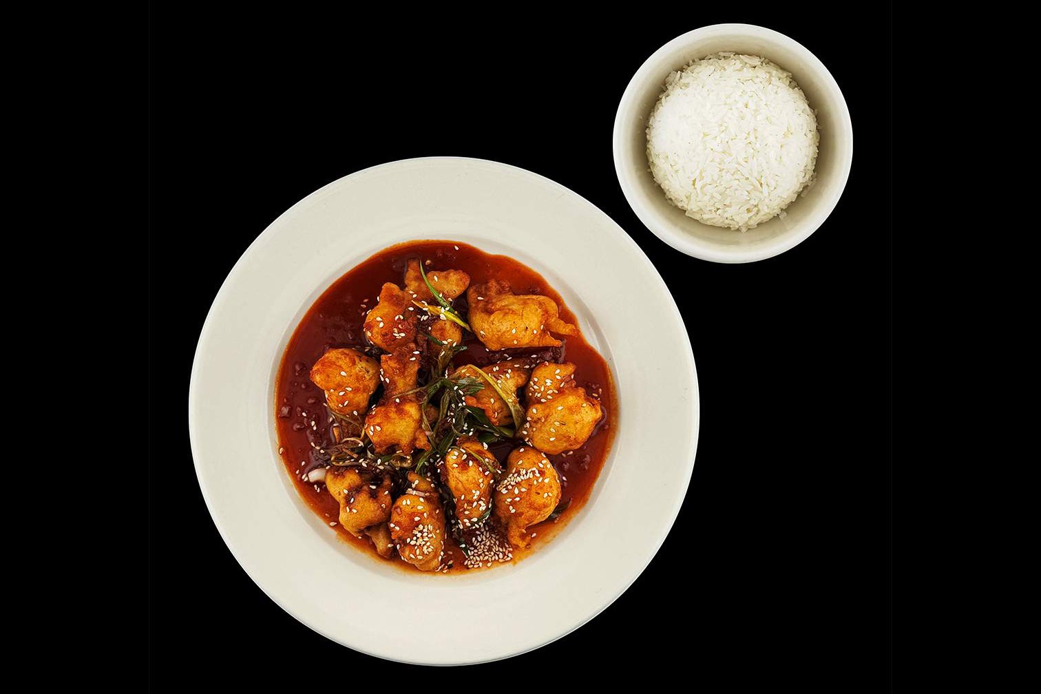 A6 KOREAN SWEET & SOUR Knuspriger Blumenkohl im Tempura gebacken, koreanische Sweet and Sour Sauce aus Traubensaft von BioLenz und Basler spicy Bio-Gochujang-Chilipaste, Sesam, Frühlingszwiebeln und dazu Reis