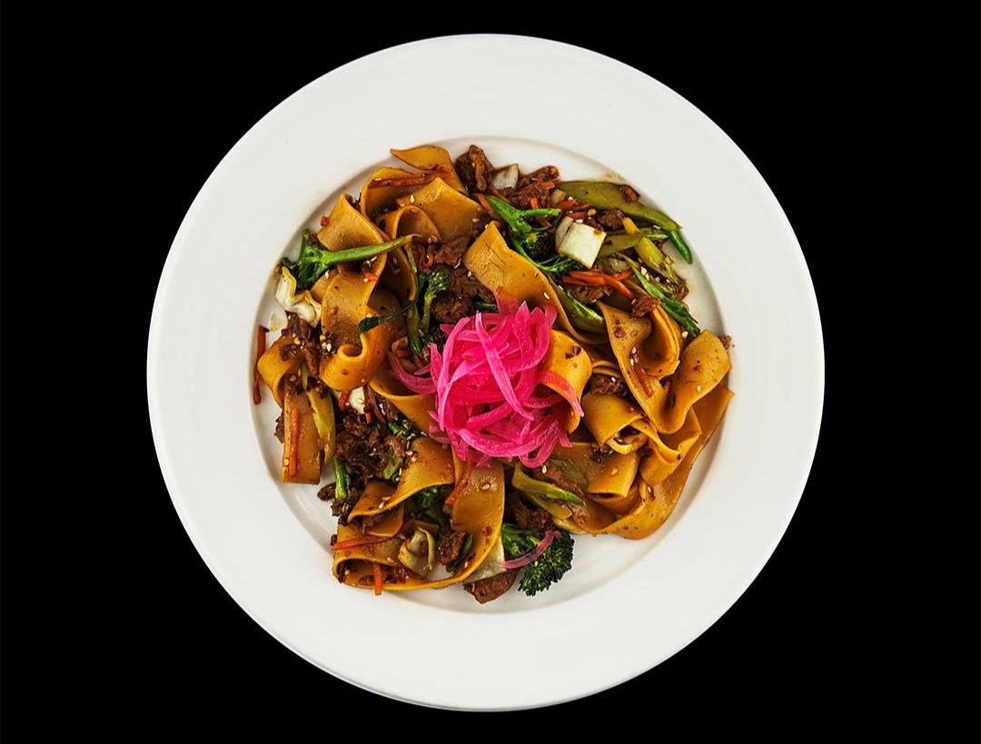 FRIED SEITAN NOODLES Gebratene Weizennudeln, Schweizer Bio-Seitan mit Mala Gewürz aus Szechuan- pfeffer, Sesam und getrockneter Chili, Bimi, Karotten, in Koji eingelegte rote Zwiebeln