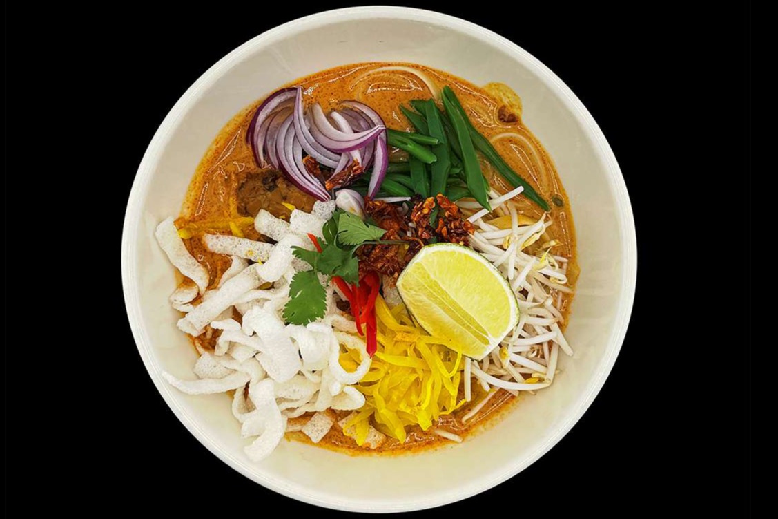 203 CHIANG MAI NOODLES Rot-gelbes Poulet-Curry, Weizennudeln, Sojasprossen, Bohnen, Papaya-Ingwer-Pickles, getrocknete Chilis, crispy Noodles