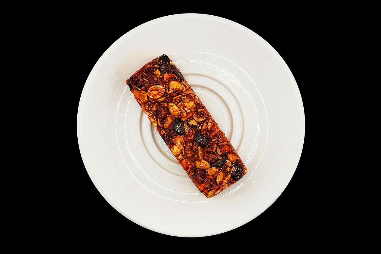 A9 LIGHTNING BAR Hausgemachter Powerriegel aus Kürbiskernen gepufftem Amaranth, Mandeln, Cashews, Walnüsse, Erdnüsse, Bio-Mango von Gebana, Kokosnussraspeln, Ingwer und Dattelsirup
