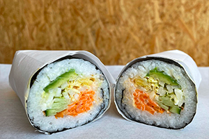 002 Veggie Sushi Roll Nori, Sushi Reis, Karotten, Gurken, Kohl, Avocado, Mango, eingelegter Ingwer, Sriracha-Mayonnaise, Wasabi-Mayonnaise