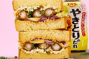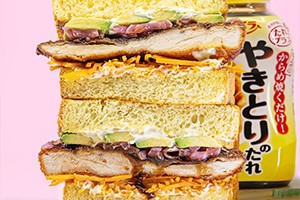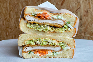 057 Chicken Avocado Sando Crispy Poulet, Avocado, Karotten, eingelegte rote Zwiebeln, Teriyaki-Sauce und Mayonnaise zwischen fluffigem japanischen Milchbrot (Shokupan)