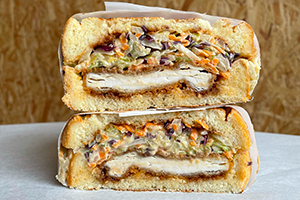 050 Chicken Crispy Sando Crispy Poulet, Karotten, Chinakohl, eingelegte rote Zwiebeln, Sriracha-Mayonnaise und Wasabi-Mayonnaise zwischen fluffigem japanischen Milchbrot (Shokupan)