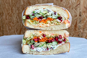Veggie Sando Avocado, Karotten, Gurken, Chinakohl, Granatapfelkerne, eingelegte rote Zwiebeln, Schnittlauch, Sriracha-Mayonnaise und Wasabi-Mayonnaise zwischen fluffigem japanischen Milchbrot (Shokupan)
