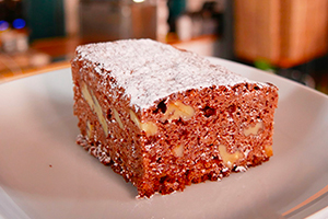 201 Schoko-Nuss-Brownie Ein grosszügiges Stück Walnuss-Brownie mit karamellisierten Haselnüssen