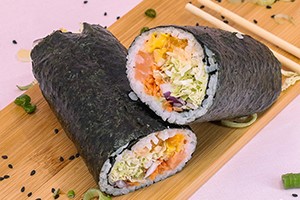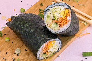 Veggie Sushi Roll Nori, Sushi Reis, Karotten, Gurken, Kohl, Avocado, Mango, eingelegter Ingwer, Sriracha-Mayonnaise, Wasabi-Mayonnaise