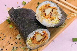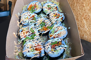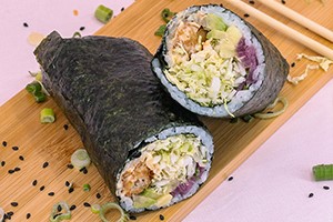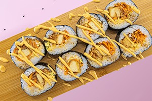 Tofu Sushi Roll Miso-gerösteter Bio-Tofu, Sushi-Reis, Nori, Chinakohl, Karotten, crispy Zwiebeln, hausgemachte Sriracha-Mayonnaise und Teriyaki-Sauce