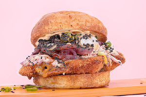 Torikatsu Burger Hausgemachte Buns, Gebratenes Tempura-Poulet, Coleslaw, Frühlingszwiebeln, Schwarzer Sesam, Bulldog-Sauce, Sriracha-Mayonnaise