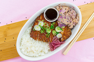 Tonkatsu Poulet im Tempurateig, Sushi-Reis, Frühlingszwiebeln, Zwiebel-Pickles und Coleslaw salat und Bulldog Sauce