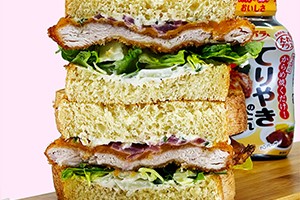 051 Chicken Katsu Sando Crispy Poulet, Coleslawsalat, Bulldog-Sauce und Chuno-Mayonnaise zwischen fluffigem japanischen Milchbrot (Shokupan)