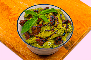 110 Pasta fredda Beilagensalat mit Garganelli, Pesto, Mozzarella, getrockneten Tomaten, Pinienkernen und Balsamico-Creme