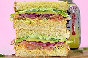 056 Lox Sando Räucherlachs, Avocado, Eisbergsalat, eingelegte rote Zwiebeln, Schnittlauch, Sriracha-Mayonnaise und Wasabi-Mayonnaise zwischen fluffigem japanischen Milchbrot (Shokupan)