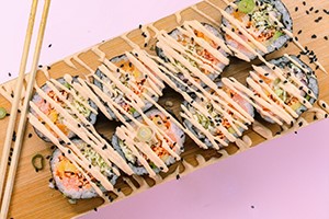 Salmon Sushi Roll Frischer Lachs, Sushi-Reis, Nori, Avocado, Karotten, Chinakohl, eingelegte rote Zwiebeln, Soja Protein Crispies, hausgemachte Sriracha-Mayonnaise und Wasabi-Mayonnaise