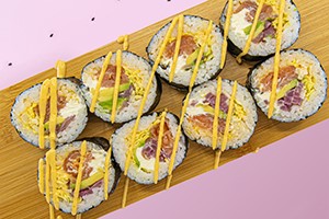 004 Salmon Sushi Roll Frischer Lachs, Sushi-Reis, Nori, Avocado, Karotten, Chinakohl, eingelegte rote Zwiebeln, Soja Protein Crispies, hausgemachte Sriracha-Mayonnaise und Wasabi-Mayonnaise