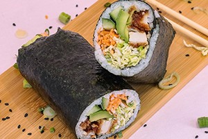 Teriyaki Sushi Roll Crispy Poulet, Sushi-Reis, Nori, Avocado, Karotten, Chinakohl, eingelegte rote Zwiebeln, Soja Protein Crispies, hausgemachte Sriracha-Mayonnaise und Teriyaki-Sauce