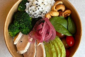 051 Moa Poke Poulet, Reis, Avocado, geröstete Cashews, Brokkoli, Cherrytomaten, eingelegte rote Zwiebeln, schwarzer Sesam und Poke Sauce