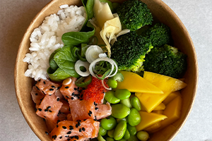Maui Poke Frischer Lachs, Reis, Mango, Edamame, Brokkoli, Gurke, Soja Protein Crispies, schwarzer Sesam und Poke Sauce