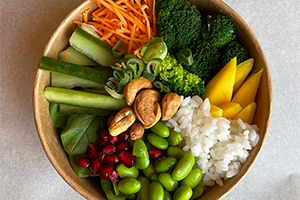 054 Omao Poke Brokkoli, Reis, Edamame, Mango, Granatapfel, geröstete Cashews, Cherrytomaten, Karotten, Gurke und Poke Sauce