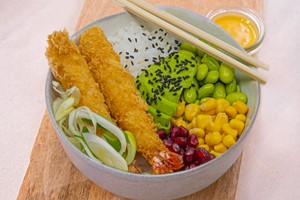 052 Ula Poke Tempura-Garnelen, Reis, Avocado, Edamame, Granatapfel, eingelegte rote Zwiebeln, Gurke, Nori, schwarzer Sesam und Poke Sauce