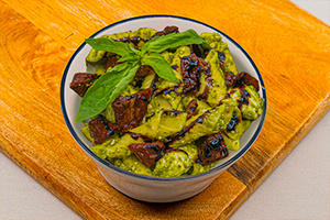 114 Pasta fredda Beilagensalat mit Garganelli, Pesto, Mozzarella, getrockneten Tomaten, Pinienkernen und Balsamico-Creme