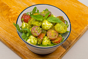 115 Caprese-Salat Kirschtomaten, Mozzarella, Rucola-Salat, Pesto und Basilikum