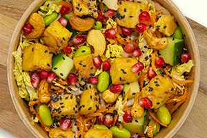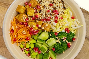 A03 Tofu Gang Miso-gerösteter Tofu, Wildreis, Chinakohl, Brokkoli, Gurke, Edamame, Soja Protein Crispies, Granatapfel – mit Miso-Sesam-Ingwer-Dressing