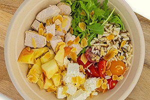 A01 Harvest Bowl Poulet, Wildreis, Cherrytomaten, Äpfel, Fetakäse, Rucolasalat, geröstete Mandeln – mit French Dressing