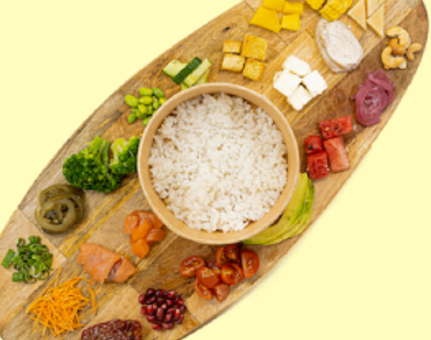 Deine Poke-Bowl Stelle deine eigene Poke-Bowl zusammen! Grundlage: Aromatische Reis mit hausgemachter Poke-Sauce