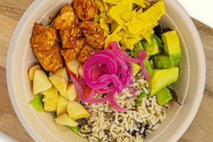 A04 Chicken Avocado Ranch US Poulet mit BBQ-Sauce, Wildreis, Avocado, Äpfel, Salatmix, Pickled Red Onions, Nacho-Crunch – mit French Dressing