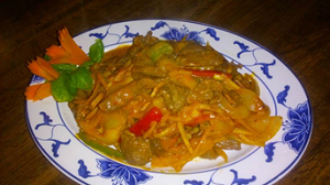 203 Curry Rindfleisch In Wok mit Paprika, Zwiebel, Aubergine, Tofu und Kartoffel gebraten
