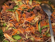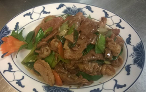 606 Gebratene Nudelns mit Rindfleisch Mit Sojasprossen, Lauch, Chinakohl und Karotte