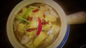 200 Meeresfrüchte Tofu In Topf mit Tintenfisch, Muschel, Garnelen und frittiertem Tofu gekocht